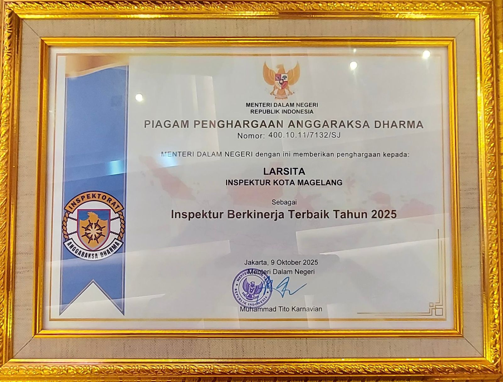 Kamis (9/10), Inspektur Daerah Kota Magelang, Larsita mendapatkan penghargaan Anggaraksa Dharma dari Menteri Dalam Negeri sebagai Inspektur Berkinerja Terbaik Tahun 2025.